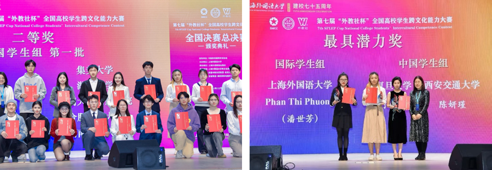The national finals consists of four segments: intercultural case presentation, analysis, Q&A, famous quote interpretation. The grand final was composed of knowledge quizzes, situational commentary on multicultural videos, Q&A, and storytelling about China. Compared to the provincial stage, each segment of the national finals was more challenging, with most tasks requiring impromptu English presentations except for the prepared case presentation and analysis. XJTU team won the second prize through its members' vivid case presentation, clear analysis of cultural conflicts, and solid intercultural theory interpretation. Chen Yanjin stood out for her fluent language, composed demeanor, and logical clarity, earning high praise from judges and securing the "Most Promising Award"—one of only two such awards nationwide in the Chinese student group, with the other awarded to Fudan University.