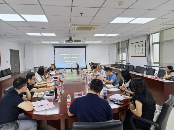 On July 7, 2025, SFS and the School of Law held a meeting to advance the “Law + English” double-degree program. Seventeen participants attended, including Ding Wei, Vice Dean of the School of Law; Li Ying, Vice Dean of SFS; and faculty and academic staff involved in the program.