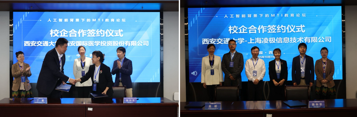 在企业代表发言环节,西安国际医学投资股份有限公司副总裁丁震、上海凌极信息技术有限公司总经理吴昕、中译语通科技股份有限公司语言服务事业群总监陈栋、北京如文思科技信息咨询有限公司医药翻译部经理史雅菁先后从不同维度分享了来自产业一线的见解。他们一致指出,当前市场对翻译人才的需求正向专业化、技术化的综合语言服务解决方案转变,并表达了与高校深化合作、共同推进人才培养的意愿。紧接着,西安交通大学外国语学院分别与西安国际医学投资股份有限公司、上海凌极信息技术有限公司举行了简短而隆重的校企合作签约仪式。