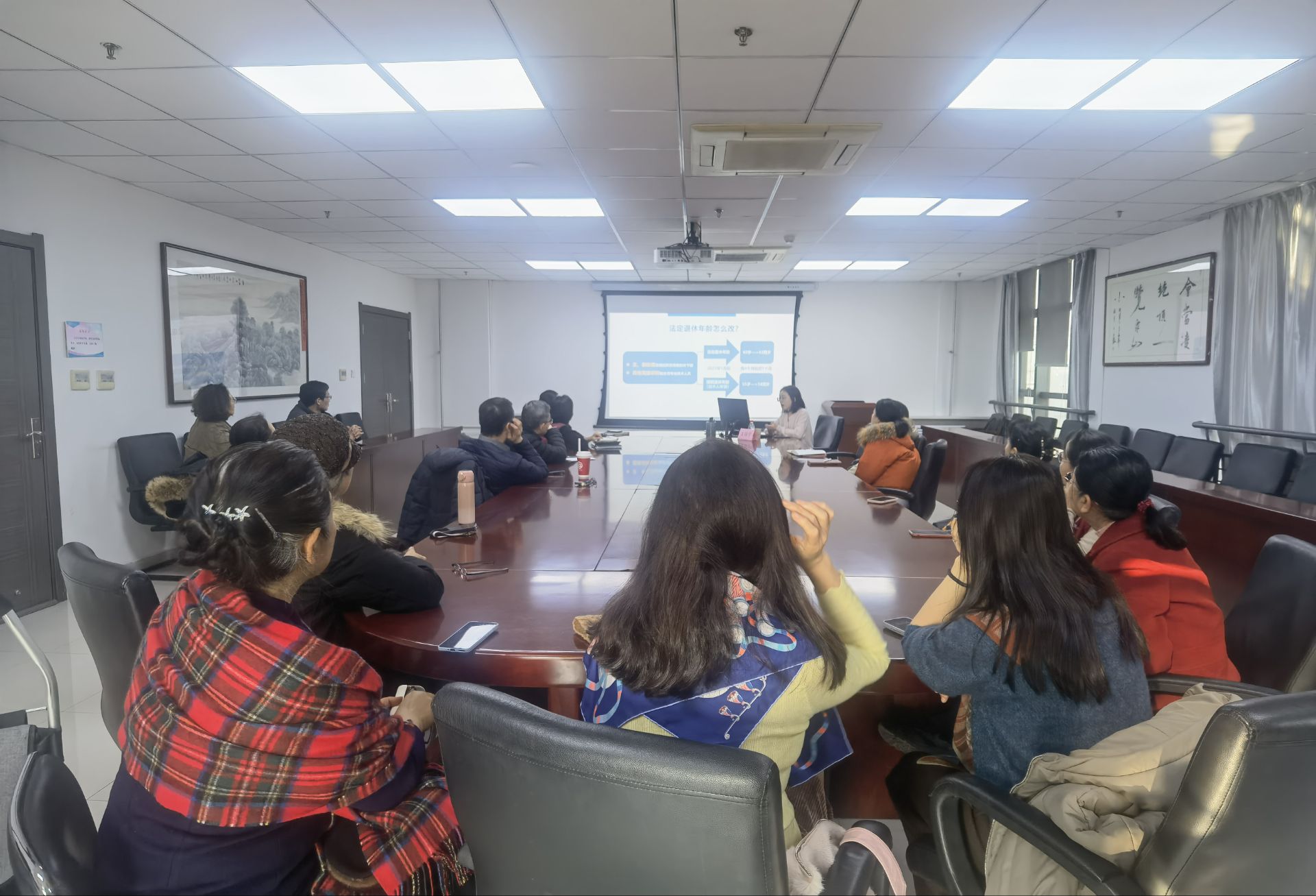 1月5日下午,外国语学院举行退休及社保政策宣讲会。人力资源部社保中心养老专干王怡宁在外文楼B912会议室为外国语学院近年退休、即将退休及在职教职工代表宣讲延迟退休及社保等政策。