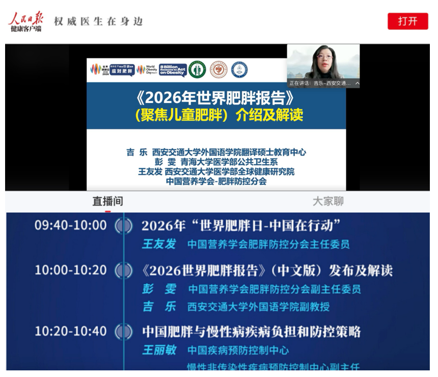 此外,吉乐老师还代表翻译工作组,受邀在3月4日上午召开的“世界肥胖日-中国在行动”肥胖防控高峰论坛上,对《报告》进行了介绍和解读。在20分钟的汇报中,吉乐老师介绍了《报告》中文版发布的由来和重大意义,也对今年《报告》的主要内容进行了发布和总结。本次论坛由中国营养学会肥胖防控分会、西安交通大学全球健康研究院、国际肥胖与代谢性疾病研究中心牵头,联动国内外100余家机构共同组织,通过人民日报健康客户端、搜狐新闻、医脉通等媒体同步直播,逾110万名观众在线参与,刷新历届参会规模。