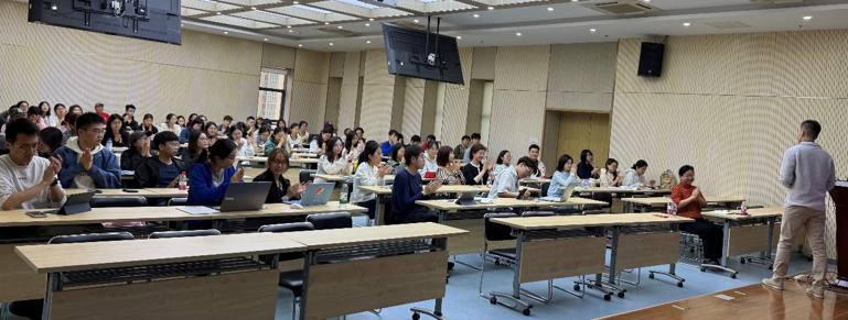 在交流环节中,同学们围绕“如何结合机遇与热爱的方向”“仅热爱语言如何跨学科”等问题提问,李文轩逐一细致解答。针对热爱与机遇的结合,他提出三步思考框架:明确长期投入方向、洞察领域真实痛点、以语言能力为桥梁,为学子们探索发展路径提供了清晰指引。对于热爱语言本身的问题,他肯定了纯粹学术路径的价值,强调成为专注的语言学家、翻译家或文化研究者,是值得尊敬且被社会需要的专业道路,鼓励学子深耕专业,无需为盲目跨界焦虑。许明副书记就企业选人标准提问,李文轩表示企业重视员工的工具运用及协作表达能力,鼓励同学们积极交流成长。日语系孙莉老师作为班主任,结合李文轩在校成长轨迹与专业发展历程,肯定了语言的跨文化沟通价值。日语系张文丽老师结合自身教学经验,进一步阐释了语言学习的深层意义。