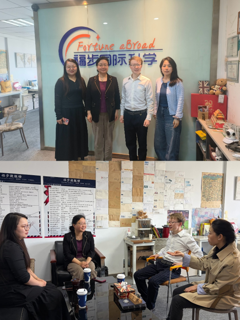 下午,许明一行来到西安福步对外交流进行参访交流,受到学院校友、总经理范勇的热情接待,项目经理刘成焱参与座谈。范勇校友回顾求学时光,介绍了企业核心业务与优势资源,表示将为学弟学妹提供职业规划、升学指导等支持,助力学子拓宽国际视野。许明对范勇校友反哺母校的情怀给予肯定和感谢,双方达成共识,将加强合作,依托校友企业优势,共同培养高素质外语人才。