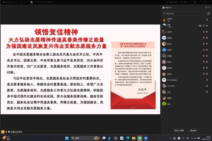 为筑牢思想根基,厚植志愿精神,培育团员青年法治素养,12月16日,外国语学院硕5124班团支部开展以“学习贺信精神践志愿初心,弘扬宪法精神育法治青年”为主题的团组织生活。团支部全体成员参加活动。