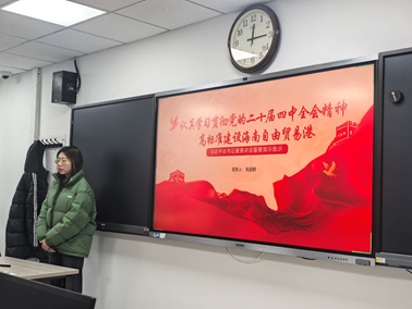 会议伊始,张庭鹤同学以“高标准建设海南自由贸易港”为主题展开领学。她从自贸港建设的时代背景切入,详细梳理了从2018年总书记宣布探索建设到2025年即将启动全岛封关运作的战略推进脉络,深入解读了党的二十届四中全会“高标准建设”的核心要义。结合自贸港工作汇报核心要点,她重点介绍了“零关税”“双15%税收优惠”等标志性政策,以及在贸易开放、产业升级、基础保障等方面取得的显著成效,强调封关运作是“更深度的开放”,彰显了我国扩大高水平开放的坚定决心,让参会人员深刻认识到海南自贸港在构建开放型经济新体制中的重要战略地位。