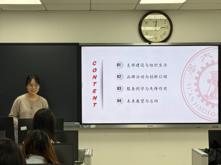 随后,支部书记刘钰璘同志代表支委班子作上一年度工作汇报,从支部建设与组织生活、品牌活动与创新引领、服务同学与先锋作用三个维度,全面总结支部工作成效与发展亮点。汇报中详细介绍了支部党员队伍建设、“三会一课”规范开展、“读原文·悟思想”双语理论学习等特色品牌活动开展情况,以及学业帮扶、社会实践等服务同学的具体举措,同时客观分析了支部工作中存在的问题与不足,明确了后续改进方向与工作重点,让全体党员清晰掌握支部发展现状。