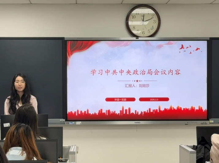 首先,刘宛莎同学领学中共中央政治局会议精神,系统解读“十四五”发展成就,深入阐释“十五五”重大战略意义,并围绕高质量发展、新质生产力、民生保障等重点内容进行讲解。她结合支部外语专业特色,推动理论学习与专业实践相结合,为会议筑牢思想理论基础。