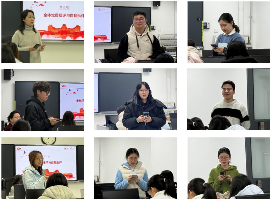 批评与自我批评环节,教师党员史鹏路率先作深刻的自我剖析,为全体党员作出表率;全体学生党员紧随其后,紧密结合自身思想、学习、工作和生活实际,深入查摆自身存在的短板不足,深刻剖析问题产生的根源。党员之间本着实事求是、互帮互促、共同进步的原则,开展坦诚相见的相互批评,提出具体的改进建议,进一步增进了支部党员间的思想交流,强化了全体党员的责任意识和担当精神。