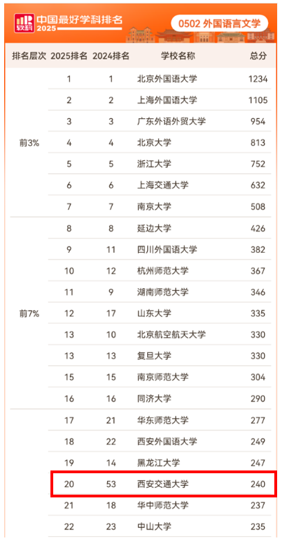 10月15日,高等教育专业评价机构软科正式发布“2025软科中国最好学科排名”。该榜单涵盖98个一级学科和5个专业学位类别,共有517所高校的5344个学科点上榜。在本次排名中,外国语言文学学科共有240所高校参评。西安交通大学该学科依托扎实的学科根基、突出的科研创新能力、良好的社会服务与学科声誉,排名从2024年的第53名跃升至2025年的第20名,首次进入前9%,展现出强劲的上升态势与综合实力。 软科中国最好学科排名(一级...
